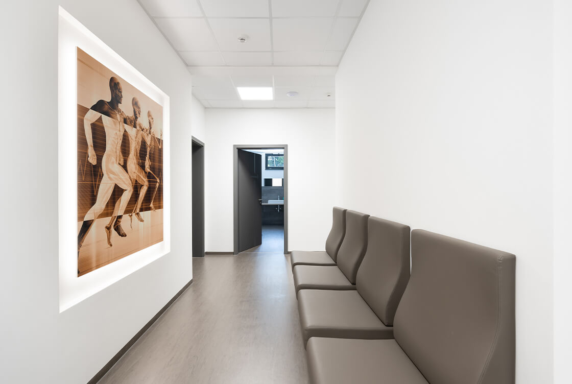 Im Inneren wurde Wert auf klare Strukturen, helle Räume und funktionale Abläufe gelegt. Großzügige Trainingsbereiche mit modernen Geräten, einladende Therapiezonen sowie praxisgerechte Nebenräume wie Umkleiden und Sanitärbereiche bieten ideale Bedingungen für hochwertige Physiotherapie und medizinische Betreuung. Die klar gegliederten Raumfolgen unterstützen effiziente Workflows und erleichtern die Orientierung für Besucher.